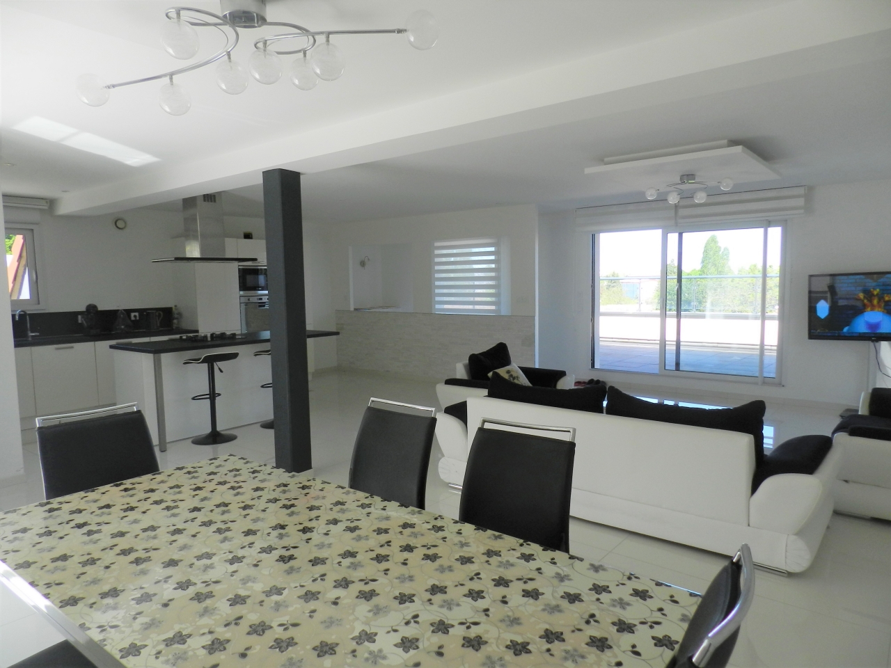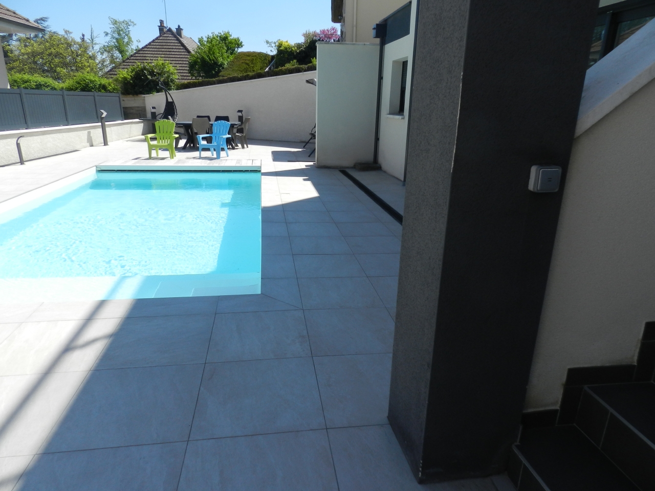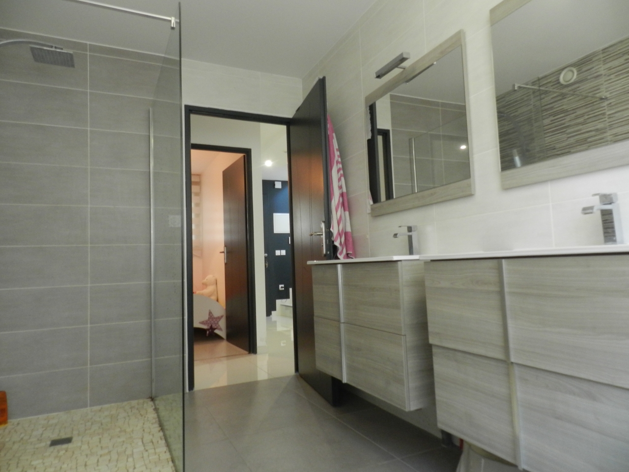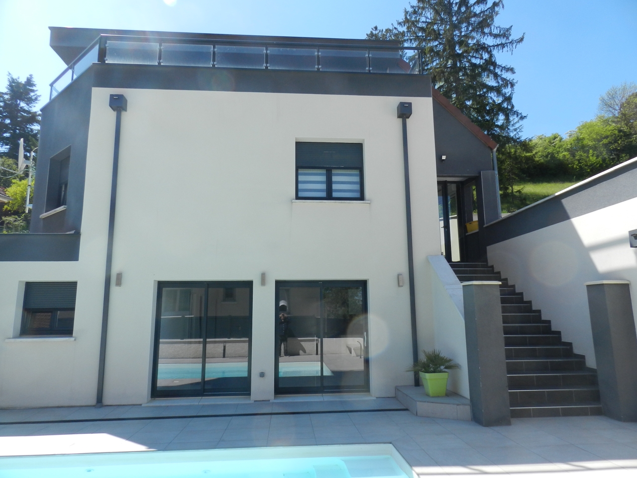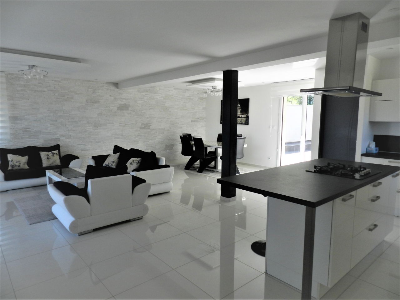 Maison contemporaine année 2015 d'une surface de 193 m² élevée sur deux niveaux, située à 5 minutes du centre ville de Dole à pieds, quartier très calme, comprenant : une vaste entrée, cuisine américaine équipée et aménagée ouverte sur salon séjour de 66 m² avec accès à deux terrasses, 3 chambres de : 10 m², 14.50 m² et 15 m², bureau, dressing, salle d'eau avec douche italienne , meuble double vasques, 2 wc. Placards et rangements. Rez-de-chaussée : pouvant convenir à un adolescent, une personne à mobilité réduite, rendement locatif ou encore pour un profession libérale, appartement T2 bis d'une surface de 70 m² comprenant : un salon séjour avec cuisine équipée et aménagée de 39 m², une chambre de 11 m², : une pièce pouvant servir de dressing, une salle d'eau douche italienne, wc. Garage et local technique de 37 m², terrain d'environ 1100 m² clos avec portail automatisé. Piscine chauffée. Chauffage au sol gaz de ville. DPE: C/C. 420 000 euros honoraires charge vendeur. Contacter Mme Fontaine agent indépendant DGD IMMOBILIER. RSAC n° 532 782 885. Greffe de Dijon. Disponible weekends et jours fériés. Référence annonce n° 1968