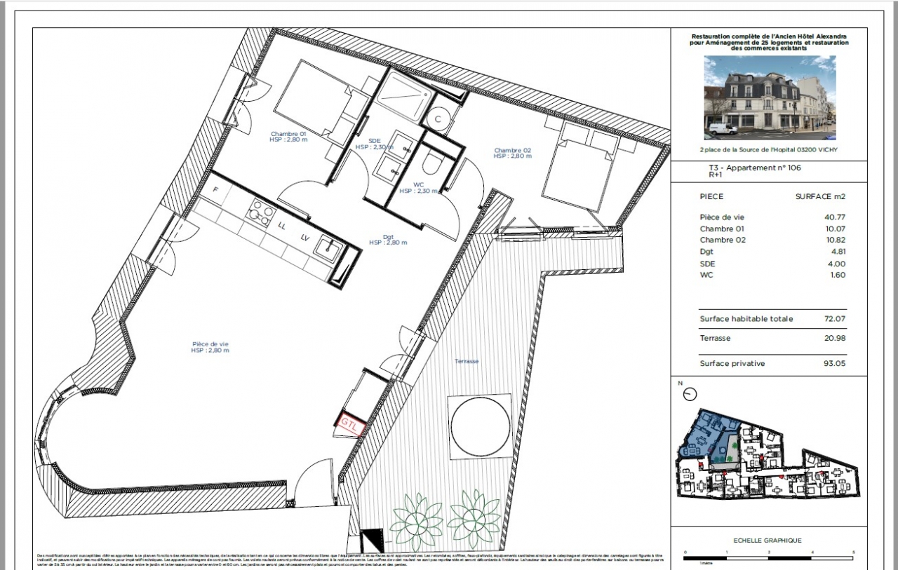 L’Alexandra, située au 2 Place de la Source de l’Hôpital, se trouve au cœur du quartier historique de Vichy, ville classée au patrimoine de l'UNESCO. Cette résidence de luxe est le fruit de la rénovation méticuleuse d’un ancien hôtel, offrant ainsi un mariage harmonieux entre l’élégance architecturale du XIXe siècle et le confort moderne.
