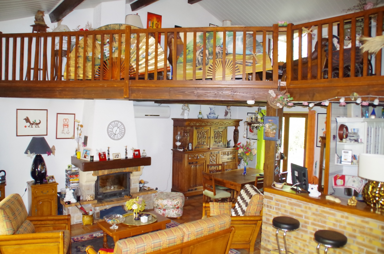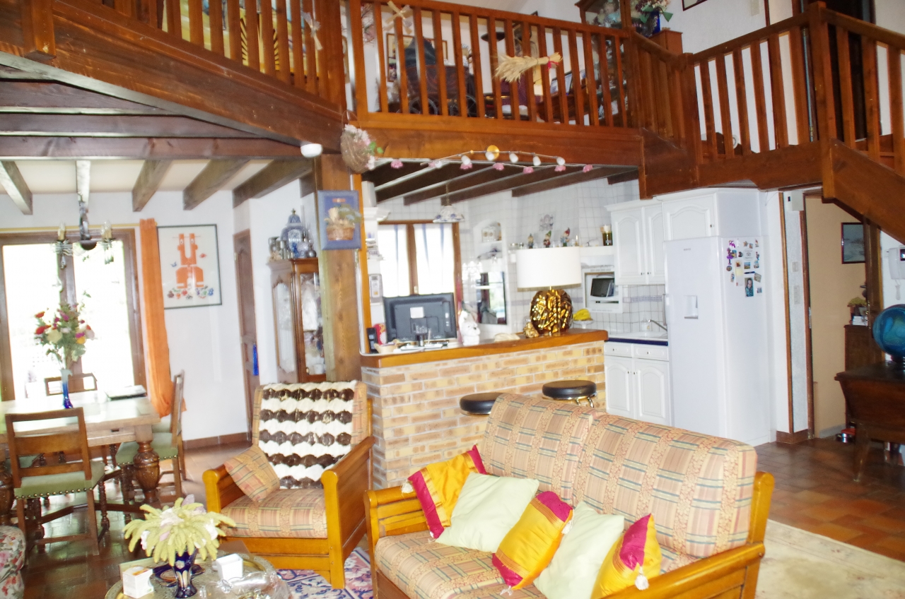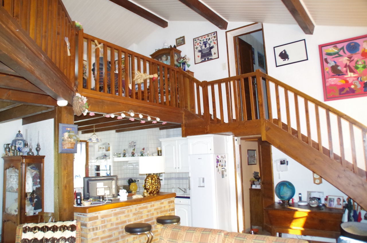 A l’étage une mezzanine en bois, 3 chambres, une salle de bain et un WC